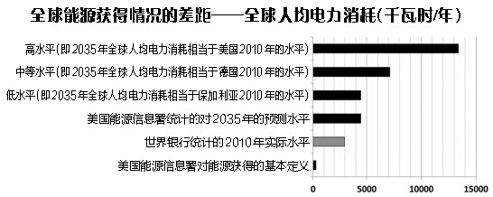 關(guān)于電力消耗的問題,可以用3個(gè)國家2010年的情況做類比。假設(shè)能源效率與能源公平相似,保加利亞、德國和美國則分別代表了能源獲得程度的低、中、高水平。2010年,保加利亞電力人均年消費(fèi)量為4500千瓦時(shí),德國為7100千瓦時(shí),而美國則為1.34萬千瓦時(shí)。2010年全球人均水平則低于3000千瓦時(shí)。
