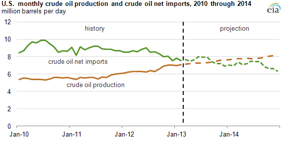 據EIA消息,美國原油月度產量有望在今年晚些時候超過原油進口量,這將是1995年2月以來的首次。依據EIA在2013年3月發布的短期能源展望,原油月度產量與進口量之間的差距有望在明年年底達到200萬桶/天。