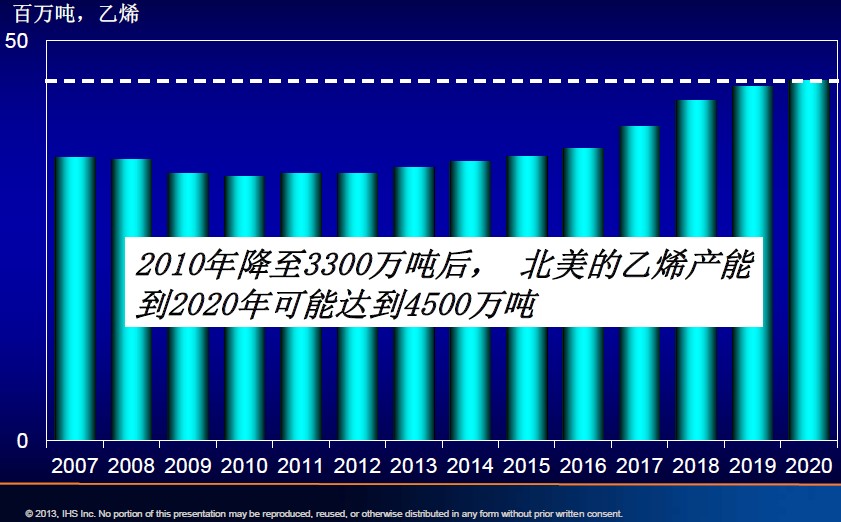 IHS預計北美乙烯產能在2020年可能達到4500萬噸,這很可能成為北美自2010年產量跌至谷底3300萬噸后的一次漂亮扭轉。
