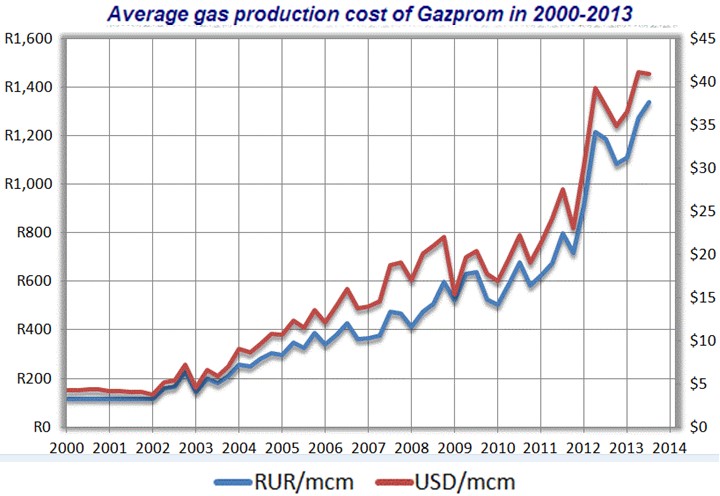 由于盧布與美元的匯率差異,有時曲線不呈平行。表中數(shù)據(jù)僅為平均生產成本,RUR為俄羅斯貨幣盧布,USD為美元,mcm為1000立方米,粗約折算2013年俄羅斯天然氣生產成本:每立方米為人民幣0.26元,但俄羅斯天然氣出口價格在10~12美元/MBtu(1 MBtu相當于28.3立方米,俄羅斯天然氣出口價格在2.3~2.8元人民幣/立方米)。