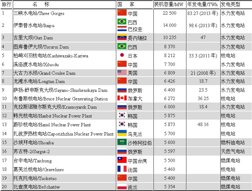 世界上最大的電站是水力發電站,其次是核電站;燃氣和燃煤為最次。中國水力發電在電力供應中最為突出,居世界領先地位。水力發電和核能發電均屬清潔能源發電,而天然氣和煤等化石燃料發電,屬于火力發電。