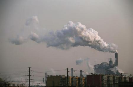 2014年2月18日,河北唐山一居民區(qū)附近鋼廠的煙囪在冒著濃煙。