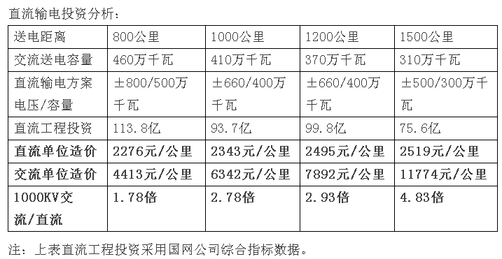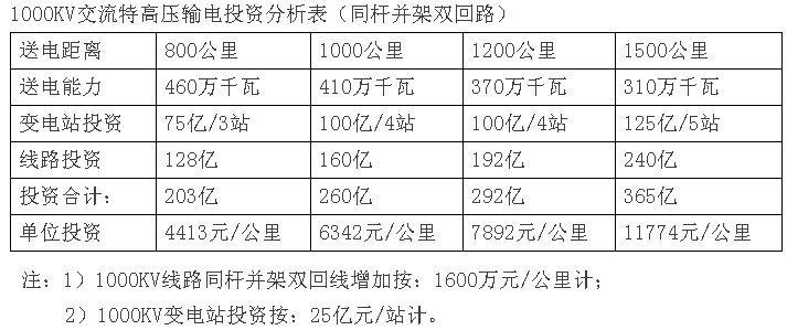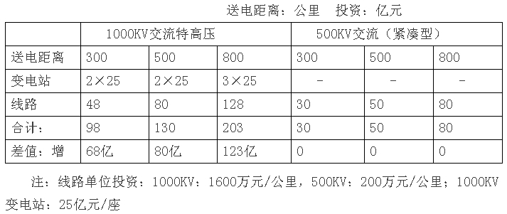 從上表可以清楚看出,1000KV線路送電800公里,送電能力為460萬(wàn)千瓦,工程投資203億元,折合每公里輸電單位造價(jià)4413元/公里;當(dāng)送電距離增加到1500公里時(shí),送電能力下降到310萬(wàn)千瓦,而輸電投資增加到365億元,折合到每公里輸電單位造價(jià)11774元/公里,增加了2.67倍。