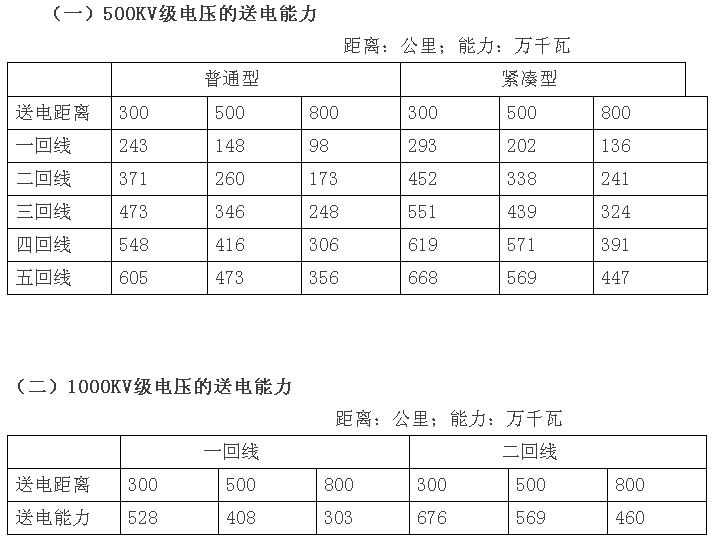 當(dāng)1000KV交流特高壓采用兩回線送電時(shí),300-800公里的送電能力為460-680萬(wàn)千瓦,平均每回線的送電能力為230-340萬(wàn)千瓦。