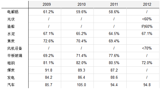 表2、中國(guó)部分行業(yè)的產(chǎn)能利用率(2009-2012)