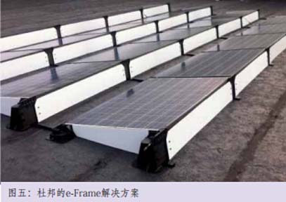 李光華在幾個月前參加完2014年日本光伏展后感觸頗深,“我們一直在尋找未來的支架材料,這次在日本看到了水泥支架、木支架、PVC塑料等多種新型支架。”事實上,著名材料供應商杜邦已經在2013年開始推廣其基于高分子復合材料的e-Frame一體化邊框支架解決方案。杜邦的秦懷禮博士表示e-Frame方案擁有輕量化和快速安裝的特點,目前已經在上海、南通、岳陽等多個分布式項目中使用。e-Frame一體化邊框系統包括成套的邊框和支架,設計成插件式結構后將加快組件安裝時間。秦懷禮告訴記者,“采用這套系統后平屋頂項目可以比常規方式節省60%的安裝時間,斜屋頂項目則能節約30%的安裝時間。綜合算下來成本要低于傳統鋁合金的邊框和支架組合。”傳統支架往往需要在屋頂上安裝一套固定系統,eFrame則相對簡單許多,“平面屋頂主要靠自重式結構進行抗風,組件陣列會加裝擋風板。如果在風速特別大的地方,支架上還有配重裝置,通過磚塊、石塊等物體做壓塊進行配重。每塊組件加8公斤的配重就可以抵抗超過級別高的大風。”一個項目業主對比鋁材支架和e-Frame支架在對抗同級別大風的情況發現,e-Frame的壓塊為8公斤,而鋁材支架的配重壓塊需要近70公斤。對于斜面屋頂的分布式項目,eFrame只需要通過膨脹螺絲來進行固定,而不用安裝鋁材支架通常所需要的導軌。