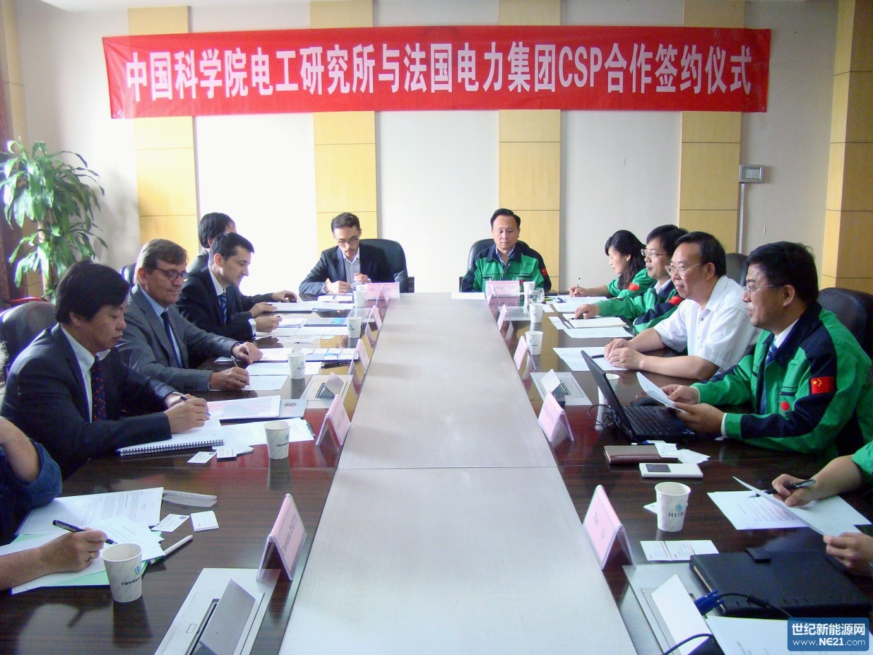 2014年6月10日,中國科學院電工研究所(IEE)與法國電力集團(EDF)在太陽能熱發(fā)電項目(CSP)合作簽約儀式在電工研究所703會議室拉開帷幕。出席簽約儀式的法方嘉賓有:法國電力集團國際合作總裁Michel MASCHI博士,法國電力大中華區(qū)執(zhí)行總裁、亞太區(qū)CFO Erwann DEBOS博士,法國電力集團中國研發(fā)中心總經(jīng)理Guofei CHEN博士,法國電力集團研發(fā)院中國事務總監(jiān)Alan YUAN博士,法國電力集團研發(fā)院國際關(guān)系合作總監(jiān)Christine PATTE等。出席簽約儀式的中方嘉賓有:中國科學院電工研究所所長肖立業(yè)博士,院太陽能熱利用及光伏系統(tǒng)重點實驗室主任王志峰博士,北京市太陽能熱發(fā)電國際合作中心主任杜鳳麗女士,中國科學院電工研究所徐二樹博士、李鑫博士,國家太陽能光熱產(chǎn)業(yè)技術(shù)創(chuàng)新戰(zhàn)略聯(lián)盟秘書長劉曉冰等。IEE與EDF從2011年9月19日簽署了雙方合作的 Memorandum of Understanding起開始太陽能熱發(fā)電技術(shù)方面的合作,主要依托于IEE八達嶺太陽能熱發(fā)電站,第一階段的合作(2011-2014 )取得了豐碩的成果。雙方在此基礎上,決定進一步深化合作以促進太陽能熱發(fā)電技術(shù)的應用技術(shù)研究以及商業(yè)化推廣。