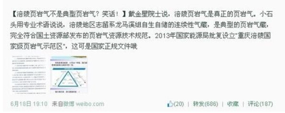 針對6月18日有媒體報道稱中石化涪陵頁巖氣項目以頁巖氣之名獲取巨額補貼的質疑,中石化在晚間連發四條微博回應有關報道,稱說“涪陵頁巖氣不是典型頁巖氣(是)笑話!”,并表示其完全符合國土資源部發布的頁巖氣資源技術規范,同時,中石化申請國家財政補貼也是正常之舉,符合規定。