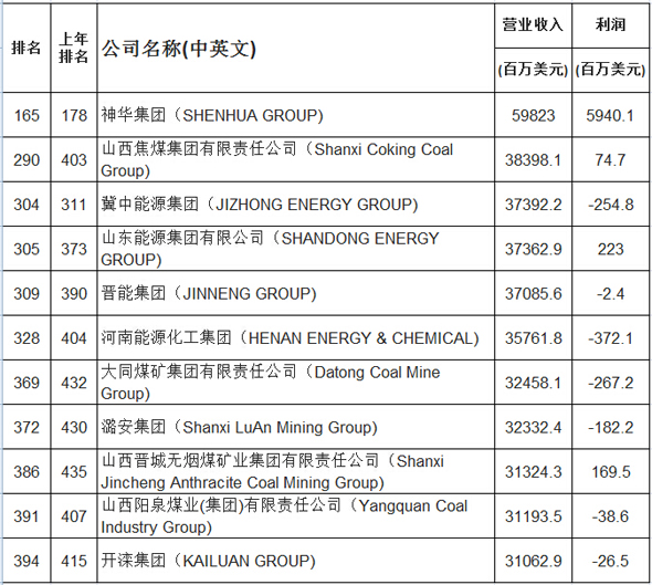 從煤炭上榜企業看,與去年相同,今年仍為11家煤企上榜,位次較上年均有所上升。其中,神華以第598.23億美元的營業收入,高居排行榜第165位,比上年的178位上升13位。山西焦煤集團有限責任公司由去年的第403位,上升至290位,成為排名上升速度最快的煤企。