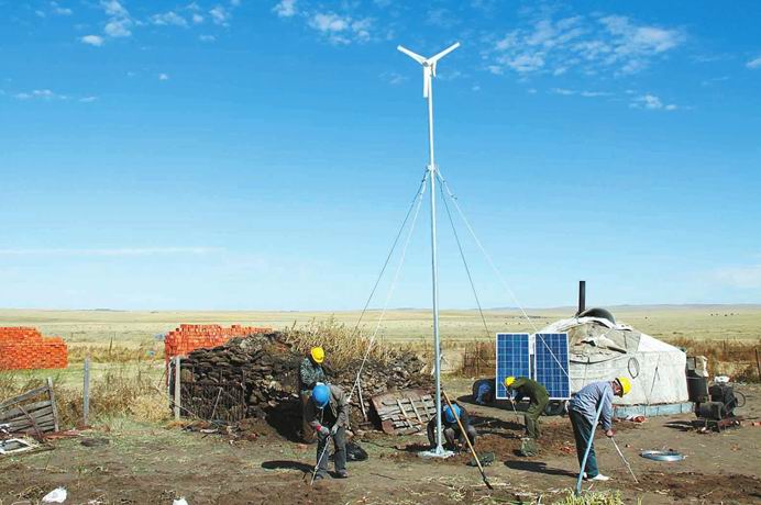 因為總面積約10萬平方千米的呼倫貝爾草原,是世界著名的三大草原之一,是中國現(xiàn)存最豐美的優(yōu)良牧場。破壞草原,愧對子孫。最后確定項目內(nèi)容為:用單戶式風光儲發(fā)電設備為草原牧民通電。因為如果用常規(guī)電網(wǎng)為草原深處的牧民供電,需要架設很長的輸電線路,其經(jīng)濟性很差,很不現(xiàn)實,對草原的破壞性也很大。而草原深處風能和太陽能蘊藏量十分豐富。采用風能、太陽能這些可再生清潔能源發(fā)電,則可基本滿足牧民們的生活及照明用電。利用單戶式風光互補發(fā)電設備既可以有效解決牧民的用電問題,又能保證草原絲毫不被破壞。因為這種設備占地面積很小,在牧民家的院子里甚至窗臺下、蒙古包旁就能安裝。