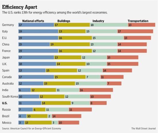 研究報告的聯合作者SaraHayes稱,經濟的每一個方面都需要能源,浪費能源的國家,他們生產同樣的產品,成本就會更高;那些投資提高能源效率的國家,它們就能以較低的成本生產同樣多的產品。