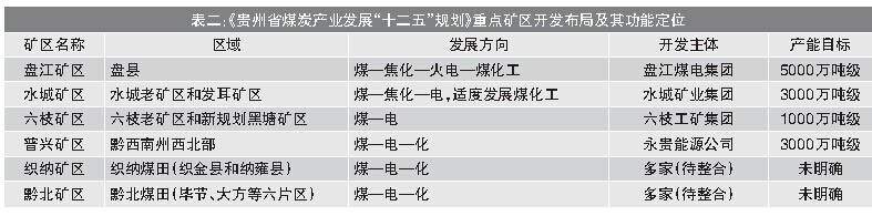 貴州含煤面積占總面積的40%以上,主要分布在六盤水煤田、織納煤田和黔西北三大區域。在各路企業搶灘資源的同時,貴州省對煤炭開發的格局做了明確劃分(見表二)。