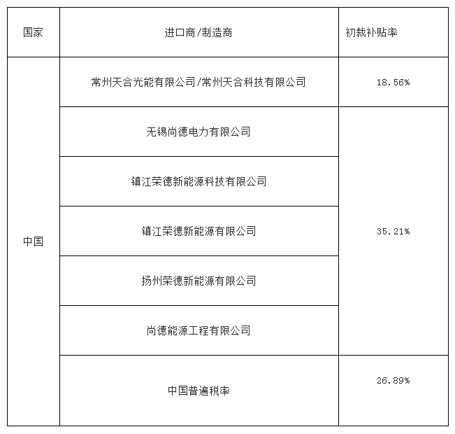 6月2日,美國(guó)商務(wù)部公布了針對(duì)中國(guó)大陸的反補(bǔ)貼初裁結(jié)果,初步認(rèn)定的補(bǔ)貼稅率如下: