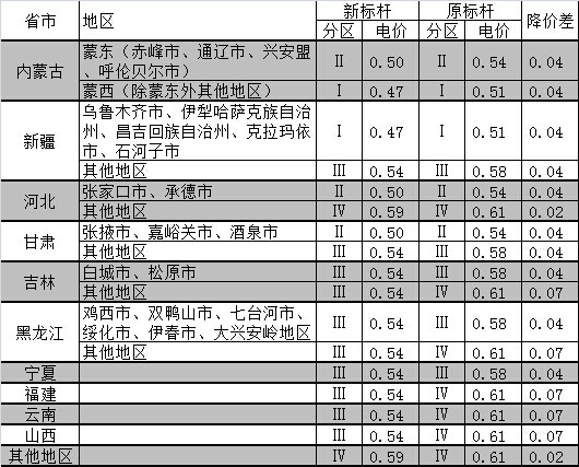 上述五省及部分地區(qū)降幅更大。其中,福建、云南、山西下降幅度為8.5%;吉林、黑龍江下降幅度則分地區(qū)有所不同,其中,吉林省白城市、松原市,黑龍江省雞西市、雙鴨山市、七臺(tái)河市、綏芬河市、宜春市、大興安嶺地區(qū)從0.58元/千瓦時(shí)下降至0.54元/千瓦時(shí),降幅6.9%,其余地區(qū)電價(jià)從0.61元/千瓦時(shí)下降至0.54元/千瓦時(shí),降幅高達(dá)11.5%。