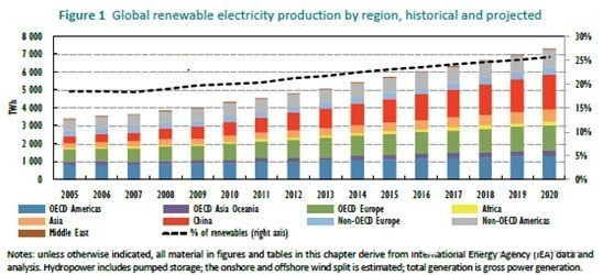圖:全球不同地區可再生能源發電量歷史數據及預測