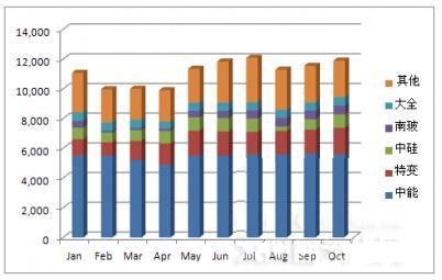 硅業分會統計,2014年9-10月份國內多晶硅產量為2.34萬噸,9月份產量為1.15萬噸,10月份產量為1.19萬噸,其中江蘇中能的產量占國內9-10月份總產量的48%,依舊位居國內產量第一位,特變電工和洛陽中硅分別居第二、三位,目前在產企業中,開工率達到100%的企業有8家,生產穩定,甚至有部分企業實現超負荷運行,進一步降低了成本,提高了效益。