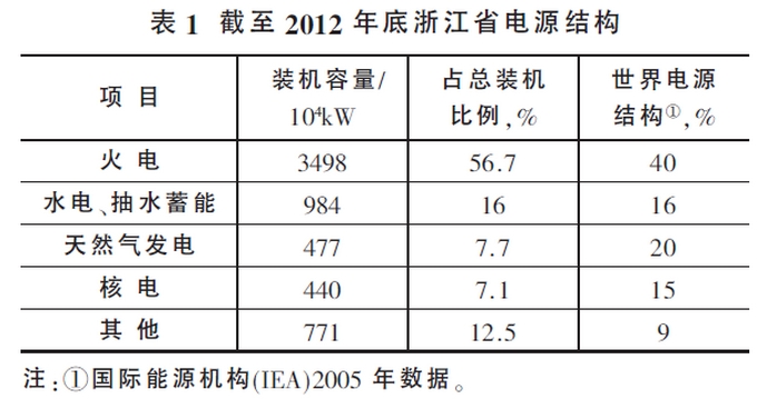 浙江省作為東部沿海經(jīng)濟發(fā)達省份,能源需求隨著工業(yè)化、城市化、現(xiàn)代化進程的不斷推進而突飛猛進。截至2012年底,浙江省電力總裝機容量為6170×10^4kW,電源結構見表1。