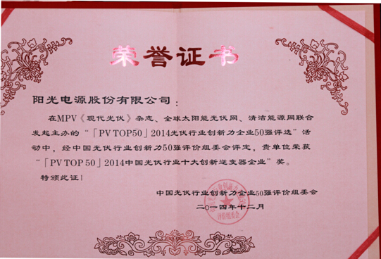 2014年12月18-20日,“2014年中國光伏行業創新力50強榜單發布及頒獎典禮”(PVTOP50)暨PVCHINA國際光伏展在上海隆重舉行,陽光電源成為唯一榮獲“2014中國光伏行業十大創新逆變器企業“等三大獎項的企業。