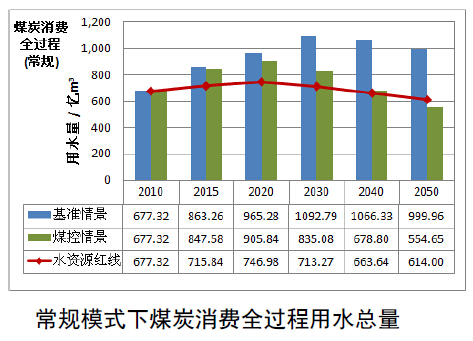 圖2常規(guī)模式下不同情景煤炭消費(fèi)用水總量及水資源紅線對(duì)比