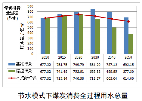 從整體來看,隨著煤炭消費(fèi)高峰的到來,煤炭相關(guān)產(chǎn)業(yè)面臨著較強(qiáng)的水資源約束,盡管節(jié)水模式比常規(guī)模式對(duì)應(yīng)情景下的用水總量有較大程度的下降,但是在近期內(nèi)仍不能滿足用水總量控制紅線的要求,只有更加嚴(yán)格地控制電力和煤化工等高耗水產(chǎn)業(yè)才能確保滿足用水紅線的約束。分析可知,一方面節(jié)水技術(shù)在煤炭開采洗選和轉(zhuǎn)化利用的用水總量控制方面發(fā)揮了巨大的作用,另一方面實(shí)行煤炭消費(fèi)總量控制對(duì)于煤炭相關(guān)行業(yè)用水總量的影響也十分顯著,二者對(duì)于降低煤炭消費(fèi)用水總量、緩解區(qū)域水資源供需矛盾具有重要作用。要實(shí)現(xiàn)煤炭消費(fèi)與水資源開發(fā)利用的協(xié)調(diào)發(fā)展,煤炭總量控制和節(jié)水技術(shù)應(yīng)用缺一不可。