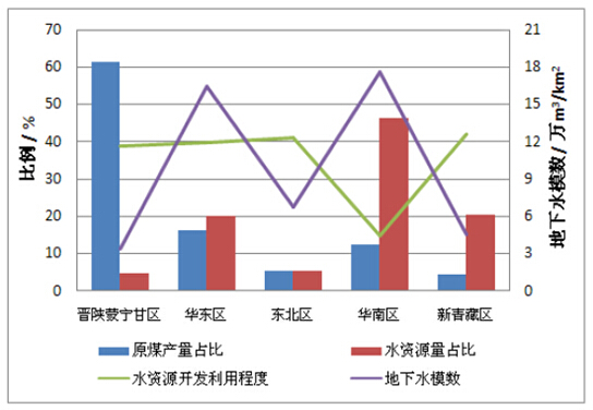 中國煤炭資源和水資源呈逆向分布特點(diǎn)。煤炭資源儲(chǔ)量西多東少、北豐南貧,而水資源分布則是南多北少。大部分重點(diǎn)煤炭基地處于水資源供需矛盾較為突出的地區(qū),水資源嚴(yán)重制約煤炭的消費(fèi)與開采。全國14個(gè)大型煤炭基地大多存在不同程度的缺水。其中,晉陜蒙寧甘等地區(qū)水資源供需矛盾尤其突出,其原煤產(chǎn)量超過全國總產(chǎn)量的60%,而水資源占有量僅為全國總量的4.8%;部分地區(qū)煤炭開采洗選用水量超過了區(qū)域工業(yè)用水總量的50%,這對(duì)缺水地區(qū)水資源供需形勢(shì)產(chǎn)生了較大的影響(圖1)。此外,煤炭轉(zhuǎn)化利用相關(guān)的火電及煤化工等高耗水行業(yè)持續(xù)發(fā)展,其對(duì)水資源的需求難以滿足,往往只能擠壓生態(tài)環(huán)境用水,相應(yīng)的取用排水過程也對(duì)區(qū)域水資源和水環(huán)境形勢(shì)帶來了嚴(yán)重挑戰(zhàn)。煤炭開采過程直接破壞了地下水含水層結(jié)構(gòu),導(dǎo)致土地塌陷和土壤沙化。不間斷、大規(guī)模采煤引起的地面塌陷、地下水漏斗以及水污染等,對(duì)區(qū)域水資源造成極大的破壞。
