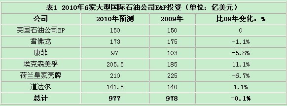 調(diào)查顯示,2010年國(guó)際大石油公司在北美E&P投資將有所下降,但在北美以外地區(qū)的投資將有小幅度增長(zhǎng)。預(yù)計(jì)全球6大國(guó)際石油公司在全球E&P投資將減少0.1%(表1),其中BP、雪佛龍和道達(dá)爾與2009年基本持平,康菲和殼牌分別下降5.8%和6.7%,而埃埃克森美孚則增長(zhǎng)11.1%。