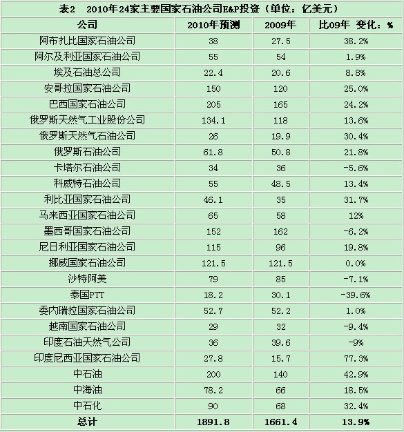 根據(jù)調(diào)查結(jié)果,2010年投資額在10億美元以上的24家國(guó)家石油公司油氣E&P投資大約1892億美元(表2),同比增長(zhǎng)14%。2010年,阿爾及利亞、挪威和委內(nèi)瑞拉等3家國(guó)家石油公司E&P投資將與2009年基本持平;泰國(guó)PTT、沙特阿美、印度石油天然氣公司和卡塔爾、墨西哥與越南等6家國(guó)家石油公司E&P投資同比將下降5-10%,其中泰國(guó)PTT公司下降幅度將高達(dá)39.6%;亞洲、非洲、俄羅斯及其他地區(qū)的15家國(guó)家石油公司E&P投資增幅均在兩位數(shù)以上,其中,印尼國(guó)家石油公司投資增幅最高,達(dá)77.3%,中石油、阿布扎比國(guó)家石油公司、中石化、利比亞國(guó)家石油公司和俄氣石油公司的投資增幅將分別達(dá)到42.9%、38.2%、32.4%、31.7%和30.4%。