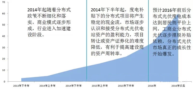 從14年年底到15年年初行業發生的一些變化來看,個人認為分布式光伏行業應該處于第一階段發展過程中(建設加速),并逐步進入第二階段(融資口逐步放開)。