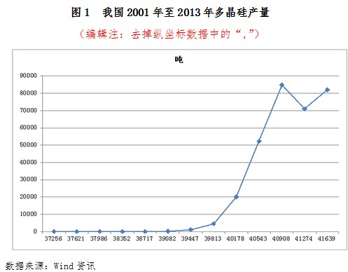 多晶硅是光伏產(chǎn)業(yè)最主要的原材料。我國(guó)多晶硅工業(yè)起步于上世紀(jì)50年代,但早期發(fā)展并不景氣。近年來隨著光伏市場(chǎng)的不斷發(fā)展,我國(guó)多晶硅產(chǎn)業(yè)獲得迅速發(fā)展,產(chǎn)量也得到迅速擴(kuò)張,從2005年到2013年,我國(guó)多晶硅產(chǎn)量從41噸迅速增至8.2萬噸,如圖1所示。