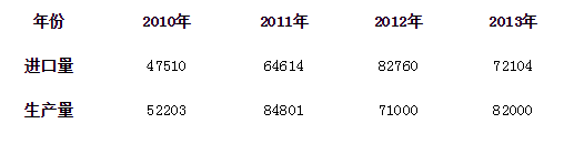 表2 2010—2013年我國(guó)高純度多晶硅進(jìn)口量與產(chǎn)量(單位:噸)