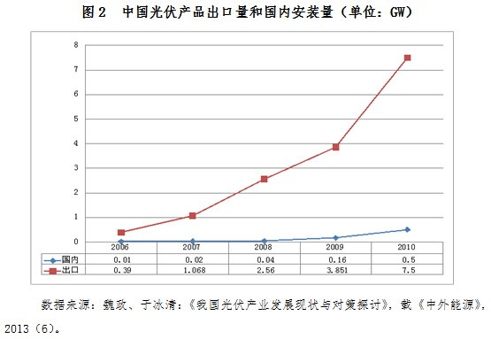 第一,現(xiàn)有產(chǎn)業(yè)政策造成光伏產(chǎn)業(yè)鏈發(fā)展不均衡。現(xiàn)有的光伏產(chǎn)業(yè)政策對(duì)產(chǎn)業(yè)鏈中制造環(huán)節(jié)的激勵(lì)作用較大,致使該環(huán)節(jié)發(fā)展速度很快。這一結(jié)果導(dǎo)致中國(guó)光伏產(chǎn)業(yè)制造環(huán)節(jié)產(chǎn)能巨大,消費(fèi)側(cè)則需求不足,大部分光伏產(chǎn)品需要依賴國(guó)際市場(chǎng)來進(jìn)行消化。