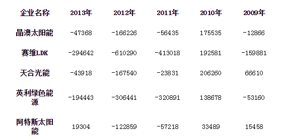 從以上分析可以看出,國(guó)內(nèi)產(chǎn)能迅速擴(kuò)張與市場(chǎng)需求緩慢增長(zhǎng)致使光伏產(chǎn)業(yè)產(chǎn)能過剩,同時(shí)外需增長(zhǎng)乏力、“雙反”政策撲面襲來等,各種國(guó)內(nèi)外不利因素涌現(xiàn),我國(guó)光伏行業(yè)走到了十字路口。從表4可以看出,我國(guó)光伏行業(yè)主要企業(yè)凈利潤(rùn)在2010年之后明顯下降,整個(gè)光伏行業(yè)陷入困境,到2012年末虧損最為嚴(yán)重。從2013年的凈利潤(rùn)指標(biāo)來看,光伏行業(yè)有回暖趨勢(shì)但仍不樂觀。