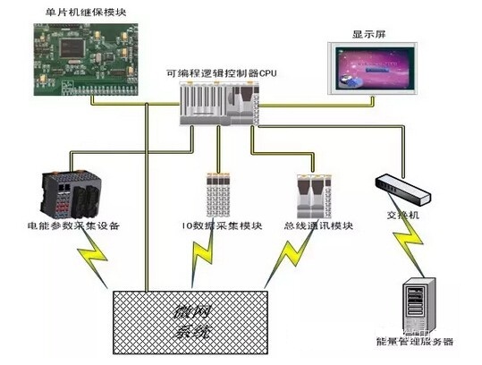 本文提出的微電網技術解決方案由微電網控制保護裝置和能量管理系統組成。其中微網控制保護裝置包括可編程邏輯控制器CPU,單片機繼保模塊、數字量模擬量數據采集設備,電能參數采集設備,總線通訊設備,光纖通訊設備、顯示屏組成。