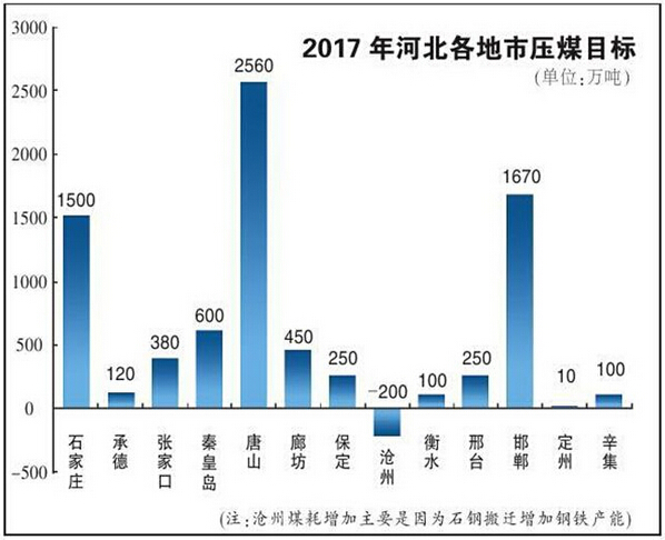 河北省已將減煤目標分解到各地市,石家莊到2017年將削減燃煤1500萬噸,邯鄲削減1670萬噸,唐山削減2560萬噸,僅這三市削減目標就已遠超全省目標。全省分解壓煤目標總數已達7790萬噸,接近華北四省市總體目標。(見左圖)2013年公布的《河北省大氣污染防治行動計劃實施方案》已經提出明確的削煤做法:禁止新建項目配建自備燃煤電站;逐步提高城市清潔能源使用比重;提高煤炭洗選比例;劃定城市高污染燃料禁燃區域,逐步推行以天然氣或電替代煤炭;削減農村炊事、采暖和設施用煤。