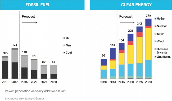彭博新聞社旗下的咨詢公司彭博新能源金融(the Bloomberg New Energy Finance)近日在紐約舉辦年會。其創始人Michael Liebreich在會上表示,2013年開始,全球可再生能源發電產能增加143GW(十億瓦),已經超過化石燃料新增產能141GW。