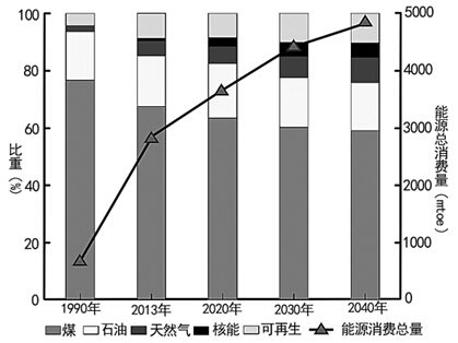 在能源消費總量上,新中國成立以后,尤其是改革開放以后,隨著國民經濟的快速發展和工業化進程的加快,我國能源消費總量迅猛增加,從1965年的131百萬噸油當量(mote)增至2013年的2852百萬噸油當量,49年間增加了21.8倍。此外,根據國際能源署(IEA)預計,未來30年內我國能源消費總量將持續增長,2040年預計將達到4834百萬噸油當量。