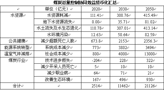 報告同時對煤炭總量控制在能源系統轉型、就業以及溫室氣體排放方面的協同效益做出了詳盡的量化分析(見下表),總協同效應(包括溫室氣體減排)在2020、2030和2050年可分別達到2514億、11462億以及21126億元。