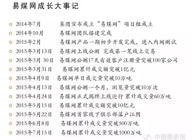 上線3個月來、易煤網累計成交量已經突破1500萬噸,預計到年底達到3000萬噸。同時,他還認為、基于行業對互聯網認識的提高和自身服務能力的提高,5年內易煤網年交易量將達到兩三億噸。