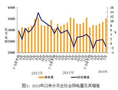 1-7月份,全國電力供需總體寬松。全社會用電量當月同比下降,三產用電量增速小幅回落。工業用電量同比負增長,輕工業用電量增速明顯回落。高耗能行業用電量持續不振,鋼鐵、建材用電量繼續下滑。發電裝機容量保持較快增長,水電當月發電量同比增速轉負。發電利用小時同比降幅擴大,九成省份火電利用小時同比下降。跨區輸送電量增速繼續回落,跨省輸送電量同比負增長。基建新增裝機規模同比增加,電源新開工規模提速。一、全社會用電量當月同比下降,三產用電量增速小幅回落