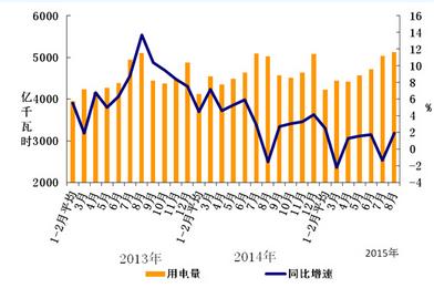 分產業看,1-8月份,第一產業用電量704億千瓦時,同比增長2.3%,占全社會用電量的比重為1.9%;第二產業用電量26431億千瓦時,同比下降0.7%,占全社會用電量的比重為71.9%,對全社會用電量增長的貢獻率為-54.3%;第三產業用電量4756億千瓦時,同比增長7.5%,增速同比提高1.7個百分點,用電量占全社會用電量的比重為12.9%,對全社會用電量增長的貢獻率為93.6%;城鄉居民生活用電量4890億千瓦時,同比增長4.3%,增速同比提高0.5個百分點,占全社會用電量的比重為13.3%,對全社會用電量增長的貢獻率為56.2%。