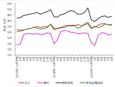 1-8月份,化學原料制品、非金屬礦物制品、黑色金屬冶煉、有色金屬冶煉四大高載能行業用電量合計11073億千瓦時,同比下降 2.1%,增速同比回落6.6個百分點;合計用電量占全社會用電量的比重為30.1%,對全社會用電量增長的貢獻率為-68.0%。其中,化工行業用電量2807億千瓦時,同比增長2.5%,增速同比回落2.4個百分點;建材行業用電量2022億千瓦時,同比下降6.4%,增速同比回落14.2個百分點;黑色金屬冶煉行業用電量3370億千瓦時,同比下降7.9%;增速同比回落9.9個百分點;有色金屬冶煉行業2875億千瓦時,同比增長4.2%,增速同比回落0.7個百分點。