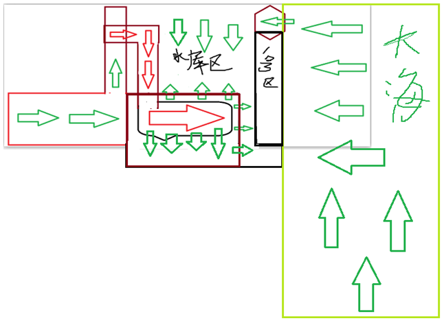 海濱水電城模式的各項(xiàng)要件都可以是動(dòng)態(tài)的,甚至包括大壩高度,都可以按我們?nèi)祟惖睦硐肴ピO(shè)計(jì),這個(gè)模式給我們的條件真是太優(yōu)越了。為什么這么說?眾所周知,大壩高度和入口水量是決定發(fā)電量的兩大核心要素。而在我這個(gè)模式里,這兩大要素都可以隨我們自由控制。我們可以設(shè)計(jì)大壩有100米的高度,也可以有200米的高度甚至更高(可以挑戰(zhàn)人類向下挖掘的深度),這都不是大問題,因?yàn)樗畮炜梢匀缟蠄D一樣與大海相連,根據(jù)水平原理,排入一號(hào)區(qū)水庫就等于是排入了大海。對(duì)不對(duì)?(另外,下面將會(huì)提到很重要的一點(diǎn),根據(jù)同等水深水的壓強(qiáng)相等原理,內(nèi)外環(huán)境的壓強(qiáng)實(shí)際上抵消掉了,外力直接打擊成了排水的主動(dòng)力,這里暫且不提)。注意,一號(hào)區(qū)位置是海濱水庫區(qū)的海堤,上面多棱進(jìn)水口將大海與庫區(qū)連成一體,并且多棱口其實(shí)是一個(gè)大型高吊水閘裝置,如果水庫出了問題,可以隨意關(guān)閘控制。這樣的設(shè)計(jì),就使我們的大壩高度有了充分的彈性,因?yàn)闊o論大壩多高,水庫都可以比壩高更低,即使再低也沒有問題,因?yàn)槲覀兊乃畮靺^(qū)與大海水面其實(shí)是連成一體的,并不是真的藏身海底。這意味著什么?這意味著,我們可以很好地解決土巖滲透這個(gè)大難題,可以在距離大海一個(gè)比較適當(dāng)?shù)奈恢蒙辖ㄔO(shè)海濱水電城,距離的遠(yuǎn)近完全由我們自己決定。是不是這樣呢?如此一來,我們也可以有大面積的水域搞水產(chǎn)養(yǎng)殖和旅游產(chǎn)業(yè),甚至為望海別墅房地產(chǎn)大開發(fā)營(yíng)造了優(yōu)美的水天環(huán)境基礎(chǔ)。
