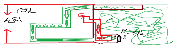 可是這個(gè)外力從何而來呢?請(qǐng)看上圖外力打擊型動(dòng)力模式。仔細(xì)分析過圖示以后,我們不難發(fā)現(xiàn),所謂外力,這里是一個(gè)巨大的重物,重物的重量,與打擊力度正好相配,并且與密閉容器內(nèi)的活塞成為了一體(注意:重物與上活塞成為一體非常重要,或者本身就是一體,或者將兩者捆綁為一體)。重物的上端用鋼索懸掛在起重機(jī)的動(dòng)滑輪吊索上,平時(shí)待命的時(shí)候,起重機(jī)施加一個(gè)向上的提升力,重物便被高高懸掛起來。重物和活塞的底下是壓縮氣體,都被封鎖在密閉容器內(nèi)。如圖。上活塞一放一拉,下位水庫的氣囊就會(huì)一擴(kuò)一縮,從而帶動(dòng)整個(gè)系統(tǒng)工作,整個(gè)排水工作就有條不紊地進(jìn)行了。