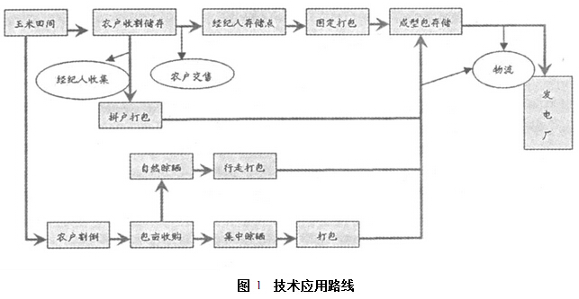 在我國,生物質原料數量雖然巨大,但來源較為分散,與西方農場化耕作模式有較大的差別,為適合我國的國情,需要建立一套科學合理的收集體系。生物質燃料的原料主要是農林業廢棄物,存在著季節性強,收集運輸困難的問題。農業生產分布在面積廣闊的農田上,農作物收割后秸稈廣泛的分布在農村地區,且秸稈體積大,不便于運輸;樹枝等林業廢棄物絕大部分分布在山區,交通不便,收集工作量大。因此,如何建立科學穩定收、儲、運體系是保證生物質直燃電廠穩步發展、安全供應的物質基礎。技術應用路線見圖1