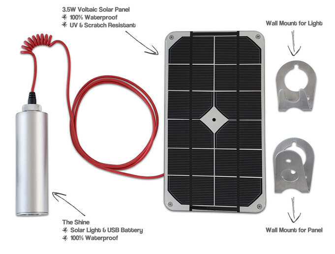 一整套Shine太陽(yáng)能充電寶手電筒的零售價(jià)為85美元,包括一塊3.5w太陽(yáng)能板、一支Shine手電筒、2個(gè)掛墻支架和一條142cm長(zhǎng)的防水懸掛電纜。如果已經(jīng)有太陽(yáng)能板,用戶還可以單獨(dú)購(gòu)買零售價(jià)為55美元的Shine手電筒,還包括一個(gè)USB轉(zhuǎn)換頭、一個(gè)掛墻支架、一條防水懸掛電纜。