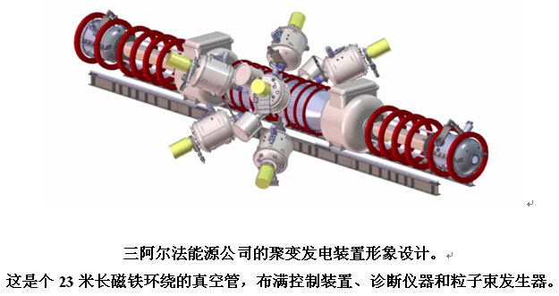 本德鮑爾說,三阿爾法公司把高能粒子加速器的原理,如大型強子對撞機用于聚變堆問題。尤其是該團隊建造了個長23米的裝置,兩個等離子體"云"相互點火,形成一個等離子體環(huán)。約束環(huán)在一起的磁場靠等離子體自身生成,這種技術(shù)稱為"反場位形"(FRC)[2]。等離子體靠加速器注入高能粒子維持。