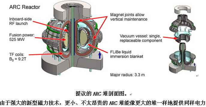 在麻省理工學(xué)院(MIT)的等離子體科學(xué)與聚變中心,核科學(xué)工程教授、這個中心的主任丹尼斯 懷特(Dennis Whyte)為首的團組和研究生布蘭登 索鮑(Brandon Sorbom),七月發(fā)表了名為ARC(買得起、強健、緊湊)機器的概念設(shè)計。這個新奇的ARC設(shè)計是電磁約束等離子體性質(zhì)的。使用最近開發(fā)的、靈活的稀土鋇銅氧化物制成的超導(dǎo)條帶,可以使ARC堆磁場的振幅高得多,因而使反應(yīng)堆設(shè)計尺寸比其他托克馬克機器小得多。研究人員還設(shè)想用液態(tài)"再生體"環(huán)繞等離子體,吸收中子避免損害,并用高效熱交換介質(zhì)發(fā)電。