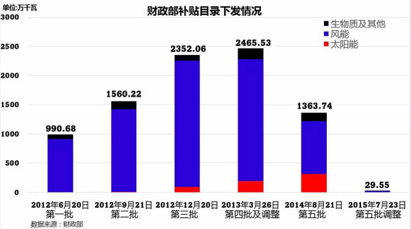 能豆君:不多說直接上圖,這是最新的補助目錄發放情況,若不計2015年7月下發的第五批調整目錄,補助目錄已經1年沒有更新。從裝機容量來看,已列入目錄的太陽能及風能項目合計8118萬千瓦,然而截2015至6月末,太陽能及風能項目合計14069萬千瓦,意味著約有5000多萬千瓦的項目因沒有列入目錄而拿不到補貼。(全國并網風電裝機容量10491萬千瓦,全國光伏發電裝機容量3578萬千瓦,光伏電站3007萬千瓦,分布式光伏571萬千瓦。)