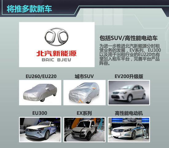 據了解,北汽新能源將于今年年底前推出EV200升級版和全新A級車;而到2016年,包括純電動SUV、EX系列、EU300以及北汽新能源與Atieva聯合開展的高性能電動汽車也將悉數登場亮相。未來北汽新能源旗下或將覆蓋轎車、SUV和MPV三個細分領域,車型級別可以從A0級擴展至C級。為進一步推進北汽新能源分時租賃業務的發展,EV系列、EU300以及用于出租行業的EU220也有望加入租車平臺,完善平臺產品陣容。
