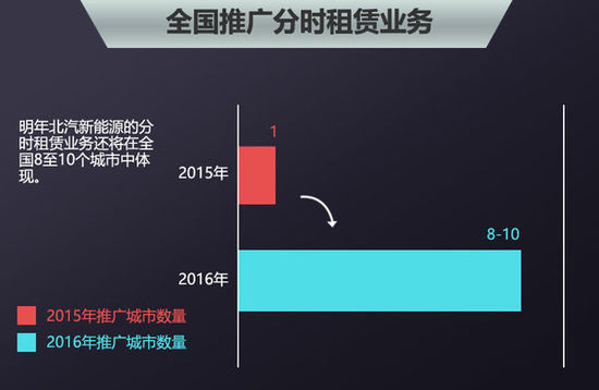 由于新能源市場的迅猛發展,越來越多的企業開始著力研發新能源汽車,作為先期布局新能源市場的北汽新能源,目前市場銷量已經超過行業平均水平。數據顯示,今年1-9月份,北汽新能源累計銷量達到11,247輛,同比增長11倍之多。市場銷量除新車的密集投放以及大力推廣外,行業渠道也是直接影響企業銷量的關鍵之一。此前,北京新能源汽車與鴻海集團共同組建了電動汽車分時租賃公司——北京恒譽新能源汽車租賃有限公司的“GreenGo綠狗租車”品牌,而后又與寶駕租車進行戰略合作,后續三方將在企業互聯網+的發展與運用進一步發力。日前,北汽新能源副總經理兼營銷公司總經理張勇在接受網通社采訪時表示:“我們已開始全面布局分時租賃業務,明年我們的發展模式將向全國8-10個城市擴張。”